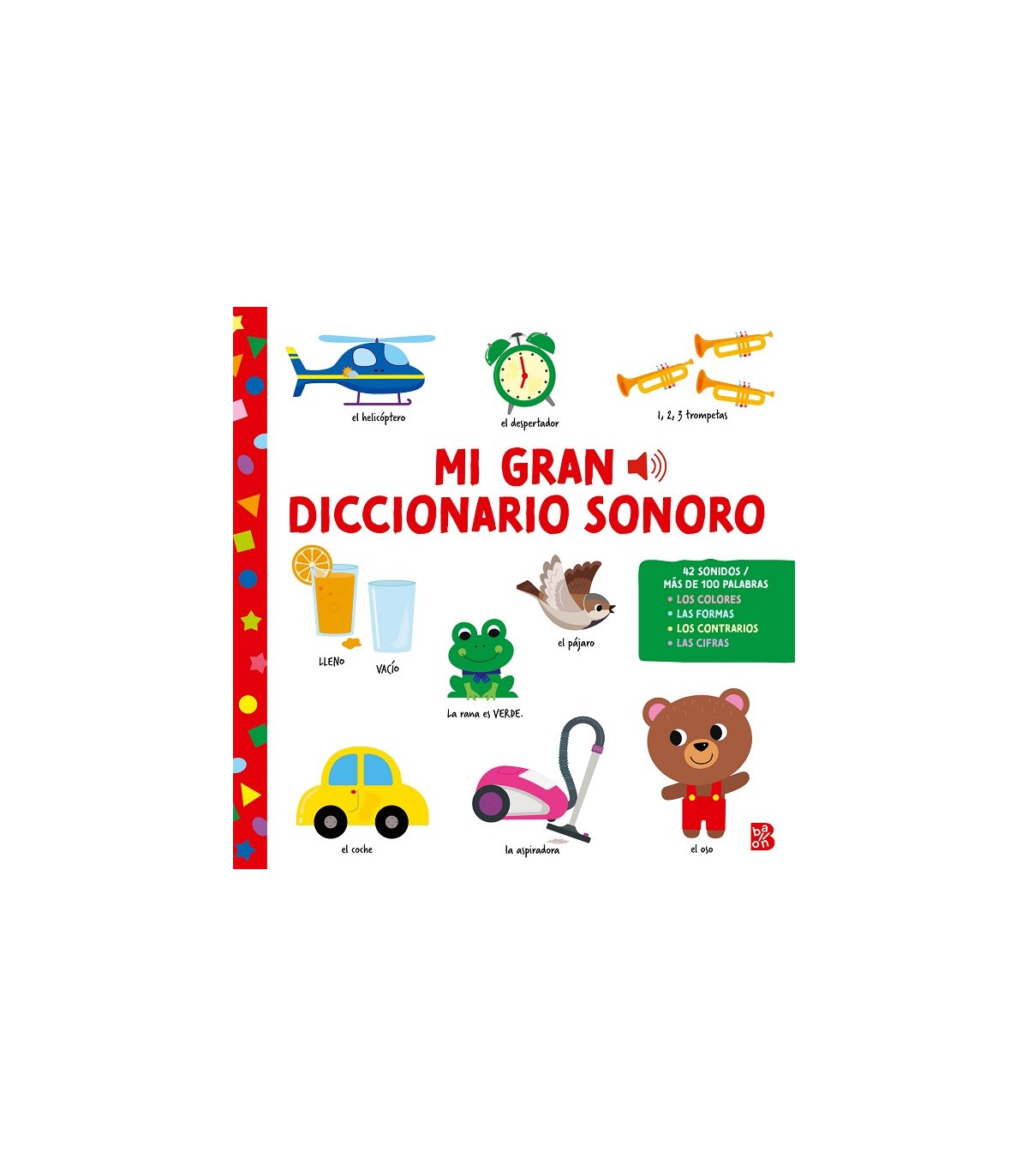 Con estos grandes libros sonoros los niños y niñas descubrirán una gran cantidad de palabras y sonidos nuevos. El libro de imágenes sonoras contiene 42 sonidos de animales. Las atractivas ilustraciones del diccionario se presentan ordenadas por temas: los colores, conceptos opuestos, los vehículos, los objetos cotidianos... Unos libros sonoros educativos que estimulan el desarrollo del lenguaje de los más pequeños.